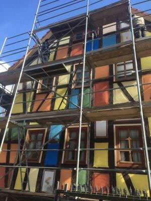 Die Geschmäcker sind verschieden. Nach dem Fällen der großen Kirsche und dem Abreißen der Efeufassade haben Dieter und sein Sohn sich an das Abwaschen, Abschleifen, Auskratzen und neu Versiegeln, Grundieren, teilweise neu Verputzen und schließlich an den Anstrich vom Gästehaus gemacht. Neun verschiedenen Farbtöne, Gold eingeschlossen, sollen es werden. Melli entwirft einen Plan, wie sich die Farben verteilen. Ihr Arrangement der Farbflächen bringt Ruhe und Harmonie in das bunte Ensemble. „Hundertwasser“, „Villa Kunterbunt“, „Ihr seid total verrückt“, „ich sag mal: gewöhnungsbedürftig“.