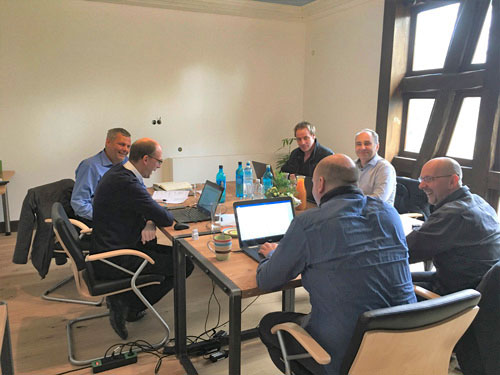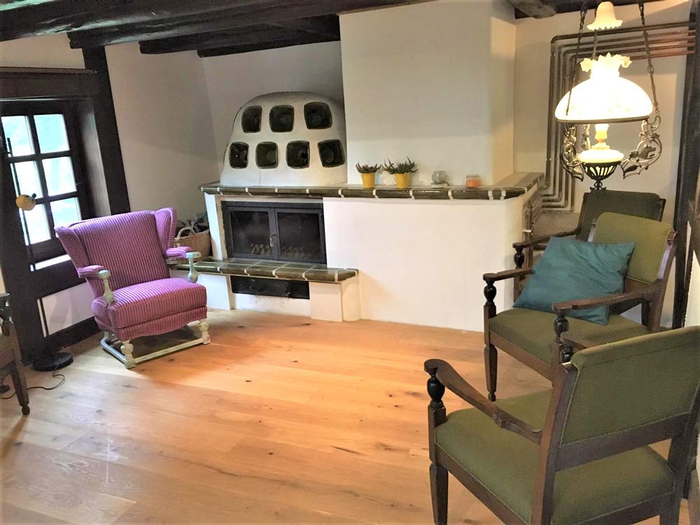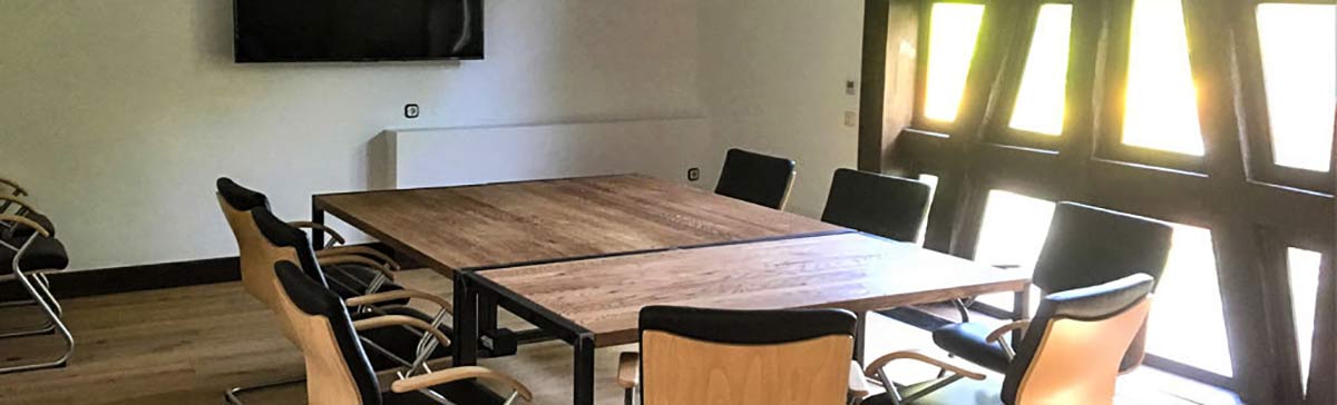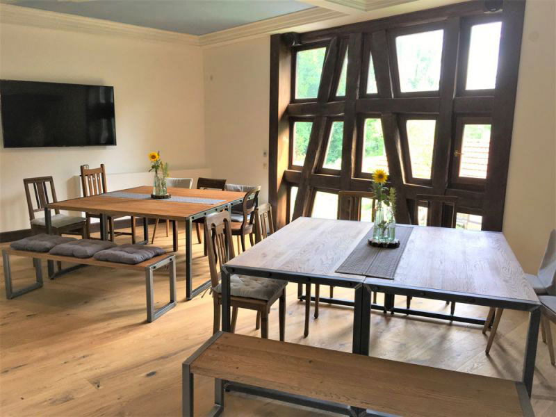 Hier könnt Ihr entspannt tagen: Ein großer Monitor, moderne Verkabelung, 50 Mbit-WLAN, flexible Betischung und Bestuhlung für 4 bis 15 Personen, verglastes Fachwerk mit Blick auf den Garten und das Niddaufer, ein Kaminofen für das Geselligsein danach.